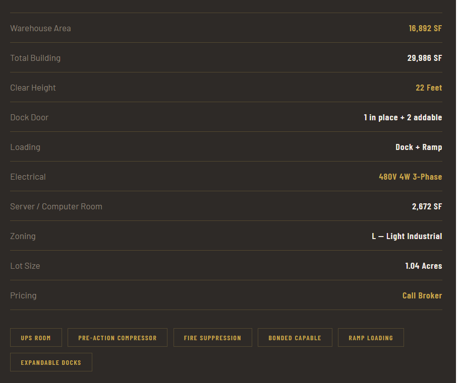 This warehouse is purpose-built for demanding operations. The 22-foot clear height accommodates tall racking systems and heavy equipment, while the pre-installed 480V three-phase electrical service eliminates costly infrastructure buildout — a critical advantage for manufacturing, distribution, or data-intensive tenants.